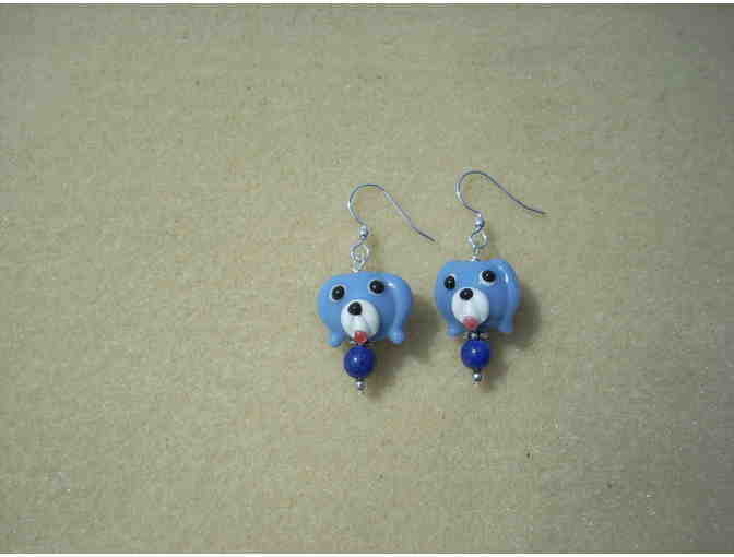 These earrings have hypoallergenic earrings wires. The blue dog bead is Lamp work and the blue bead below is Lapis. Lapis will help you quiet your mind and make good decisions.