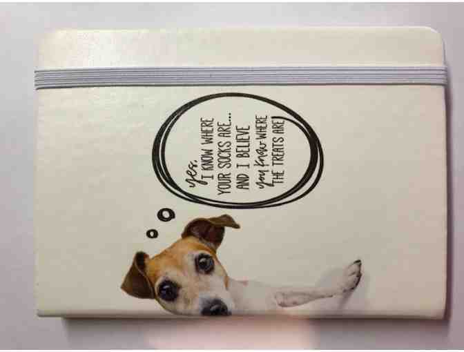 Hardbound with leatherette cover. Approximately 6 x 4 inches. 100 lined pages front and back with a satin ribbon book marker. Front cover inscribed with: Yes, I know where your socks are and I believe you know where the treats are. Perfect size for recording all those computer passwords.
