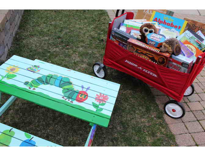 Large, collapsable Radio Flyer wagon with canopy filled with childrens books, family games, stuffed animals, puzzles, and a gift certificate for $100 for a private play experience at Lunges & Lattes Play Café + A one-of-a-kind handpainted children's picnic table. This adorable "The Very Hungry Caterpillar" themed table is great for your little ones to eat and play outdoors or indoors!