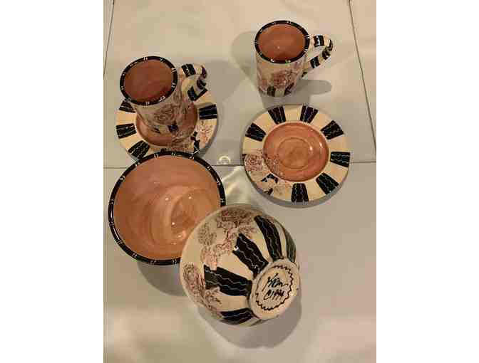 Tea Breakfast set for 2. Pink rose black ecru stripe handpainted tea set by Pat Charley. Dishwasher safe, lead-free glazes.