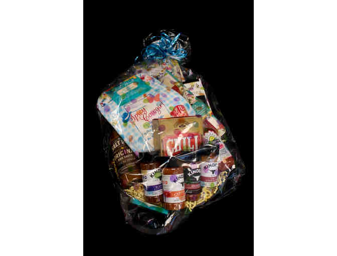 Cast iron skillet filled with towel/mitt/pot holder, kitchen utensils, and spicy things!