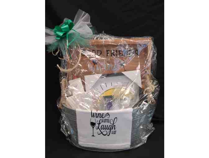 Un-"wine" after a long day with this beautiful basket of home goodies! Enjoy a bottle of Roscato or Sauvignon Blanc, and use the hand-crafted wine glasses, natural wood tray, candle and other decorative items to design a space for you to wine and laugh with friends!