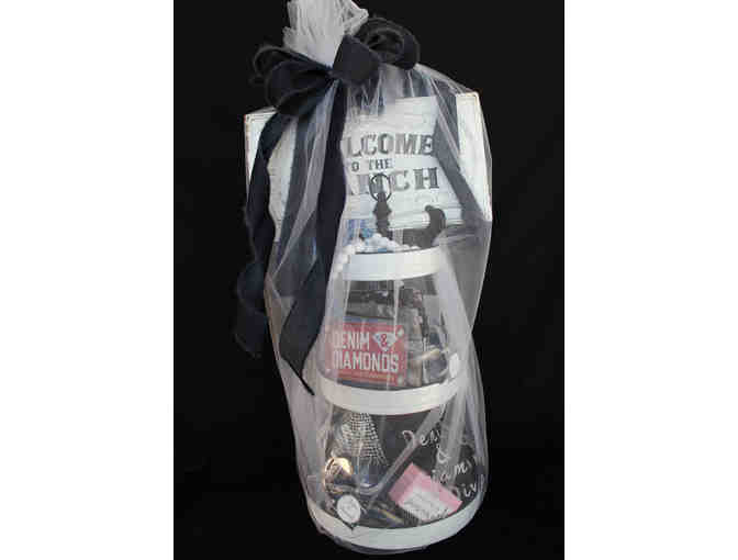 Custom-made rhinestone cup, custom-made shirt, custom-made cookies, make-up bag, bling hat, 3-tier tray, 2 wine bottles, jeweled stoppers, apple decor, guitar salt/pepper (Dolly Parton) shaker, Welcome to the Ranch stand, bling koozies, and a bling mask!