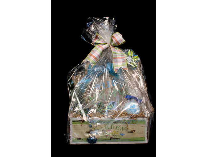 "Hello Spring" wood sign, wind chime, butterfly bowl, flower garden stake, sugar scrub and bath bomb.