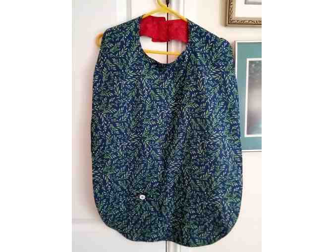 25 inches in length this is a reversible clothing protector. My mother was the inspiration. Made of 100% cotton, wash in cold water and lightly dry. While not liquid spill-proof, it will provide some protection for the clothing.