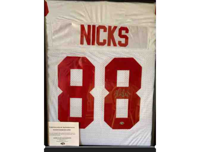 NY Giants Super Bowl Champ WR Hakeem Nicks autographed framed authentic NFL jersey. what a great item by this star receiver for Big Blue. Who can forget the amazing run in the 2011 season and the outstanding catches made by Hicks to help propel the GMen to their 4th ring!! just an amazing item for the true blue Giants fan