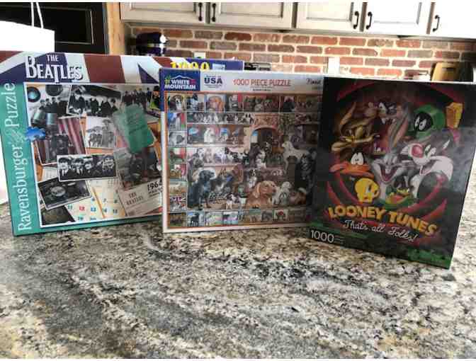 3 - 1000 piece puzzles, these are brand new unopened puzzles. The Beatles, Looney Tunes and All Dogs! These puzzles are fun and challenging!