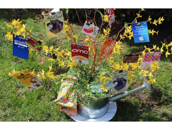 Money doesn't grow on trees, but Gift Cards do! This water can with spring blooms features gift cards galore including: