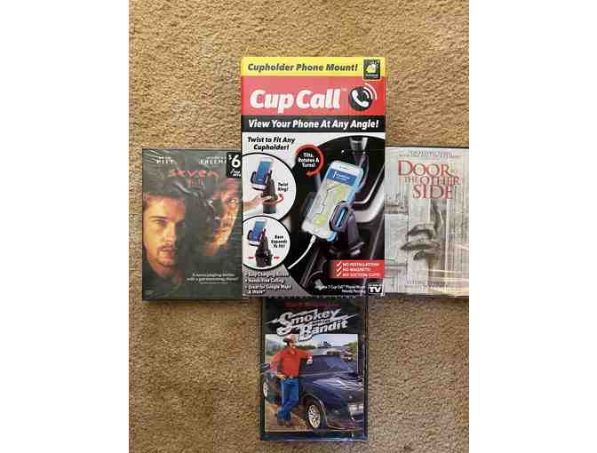 3 new/sealed DVDs and new/never used in box cellphone adjustable phone holder for car (black)
