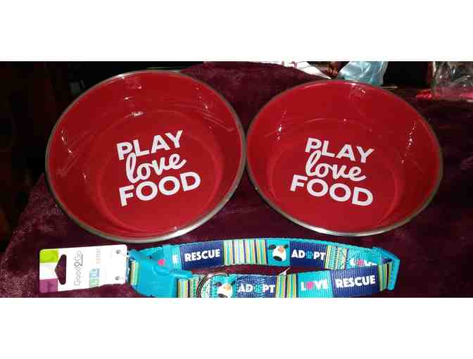 Love, Rescue, Adopt L/XL colorful collar. Plus 2 Play love Food bowls.