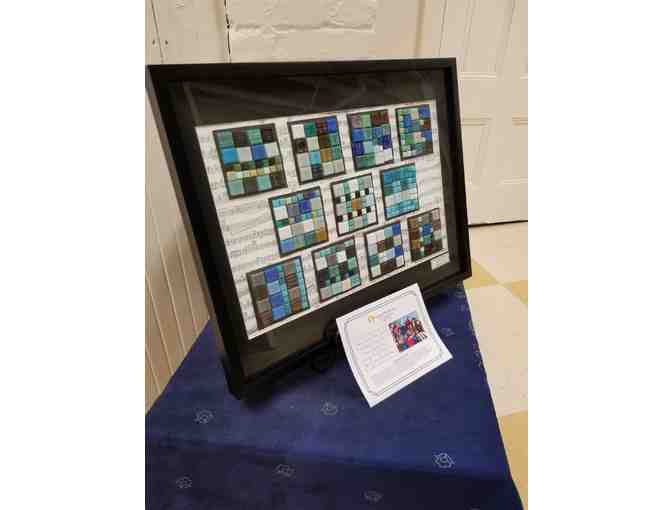 This collection of colorful mosaic tiles was inspired by two of our favorite learning topics this year. Each square was crafted by a different child using repeating patterns, symmetry, and visual design. Children experimented with possible layouts, then finalized their ideas following their own blueprint. In addition, the sheet music background includes some of our favorite classical music compositions that children enjoyed during meal times this year. These include Igor Stravinsky's "The Firebird" suite, Camille Saint-Saƫns' "Carnival of the Animals," and Paul Dukas' "The Sorcerer's Apprentice."