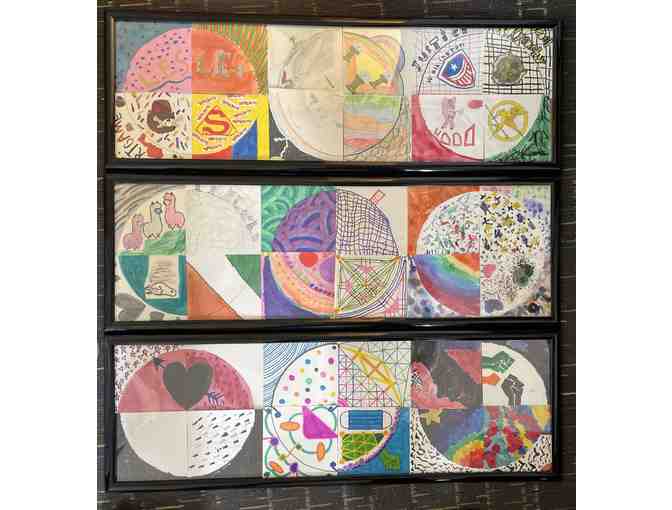 The 5th grade created an abstract classroom collage made of 9 circles. Each student contributed a design, 4/4 circle to create one interesting composition. A variety of materials including colored pencils, markers, pencil and cut paper were used to design the collage. 12''x 36''.