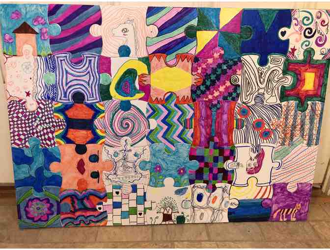 Each student made colorful intricate designed puzzle pieces glued and mounted to create one cohesive beuatiful puzzle. In grade 6, we learn how to put the pieces together. This glorious 35 piece handmade mounted puzzle will grace your home to remind you forever that the solution is yours.