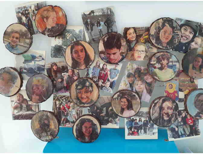 Using printed image transfer, our 8th graders put portraits of themselves and some favorite LES memories onto wooden circles and squares. Because it is the glue that bonds the ink to the wood, the paper is dampened and rubbed away, revealing a mirror image of the picture that was printed. Some areas still contain traces of paper or have been scrubbed away and this gives the whole piece a weathered look. All their individual images have been assembled into a single wall-hanging display that represents the incredible time our soon-to-be-highschoolers have had at LES. Can you believe it's almost over? We learned to ride our big wheels then we learned to ride our bikes. Next thing we know, it will be a car. But, we will never forget our childhood at LES.