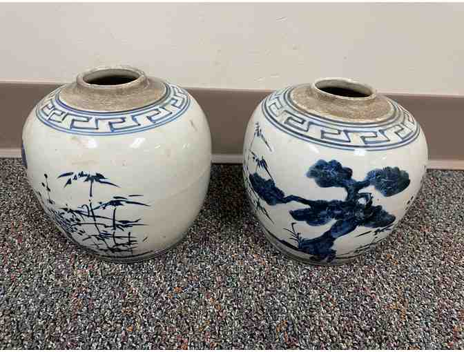 Own your very own pair of stunning blue and white lidded Chinoiserie Ginger Jars.