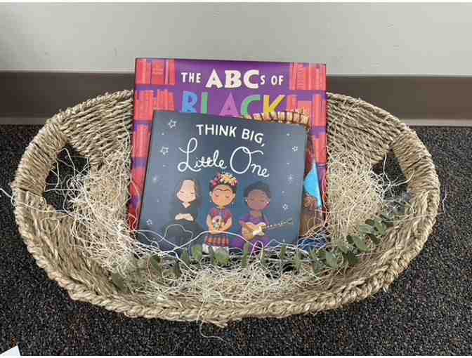 A sweet book basket with 3 classic titles - Think Big Little One, Baby Goes to Market, and The ABCs of Black History. PLUS, a $50 gift card to Kindred Stories.