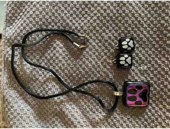 Worn once, earrings are black with silver paw print, for pierced ears, not heavy. Necklace is made from black, study silk like cord with lobster clasp with pendant being purple with black paw print.