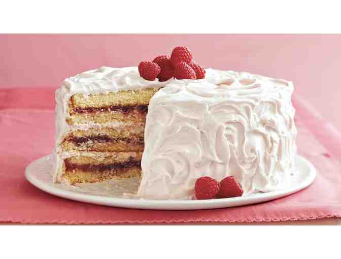 An 8" white velvet vanilla layer cake with raspberry filling, frosted with white chocolate swiss meringue buttercream.