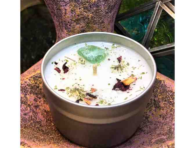 Hibiscus Palm 4oz travel tin candle with a Green Strawberry Quartz, Clear Quartz chips, Hibiscus and Peppermint, handcrafted in small batches at Spellbound's rural Ky work shop.