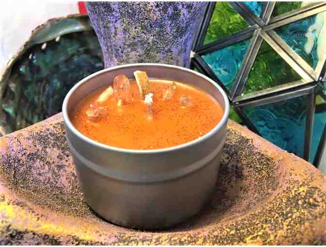 Orange Chiffon Cake 4oz travel tin candle with a clear quartz point, Orange Quartz chips and Orange peel handcrafted in small batches at Spellbound's rural Ky work shop.