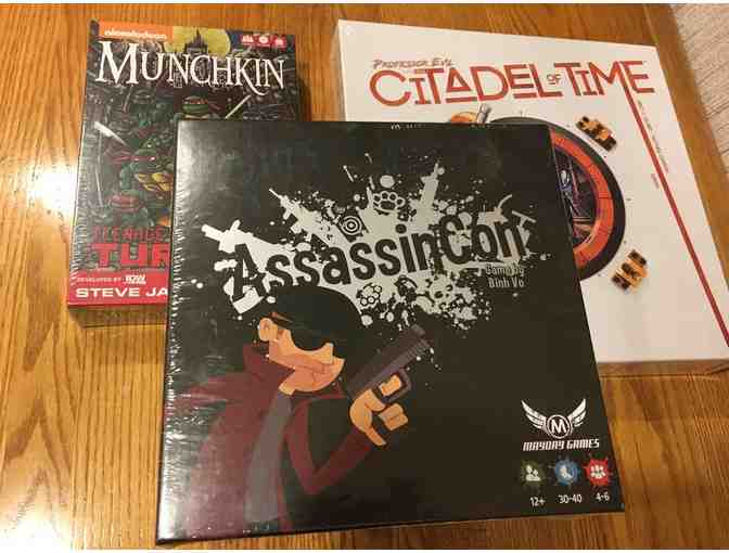 These games include one where players must cooperate, one where they must compete and one where they have the option of doing both. The games are new and still in shrink wrap. "Citadel of Time", "AssassinCon" & "Munchkin - TMNT"