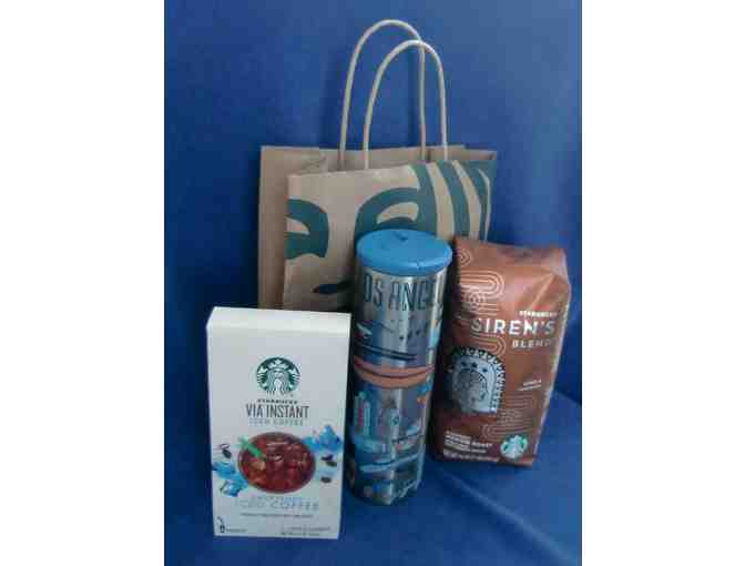 Thanks to Starbucks at 2200 Colorado Ave #101 for donating this 16oz Los Angeles Vacuum Insulated Stainless Steel Traveler Tumbler Mug, along with a 16oz bag of Siren's Blend Whole Bean Medium Roast Coffee with Citrus & Chocolate notes, and six packets of VIA INSTANT Sweetened Iced Coffee!