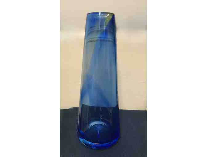 Hand-blown at McDermott Glass Studio, Sandwich; 10 ½" height. The vase has a faint stripe of yellow tint beginning at the top.
