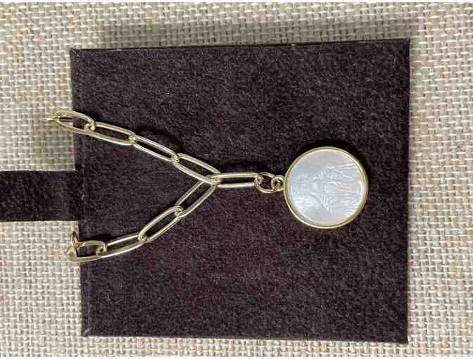 Necklace in golden paper clip chain with Milagrosa mother of pearl pendant.