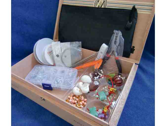 Flea Market Beads including shell, glass, Jade and plastic in purples, greens and whites in a classic wooden cigar box with brand new jewelry tools and findings! Experts and beginners can use pliers, tweezers, measuring tools with 4 types of beading wire and jewelry making supplies like jump rings, clasps, pins, crimp beads, earring hooks. Bonus organizer box and zip bag for repair or DIY fun.