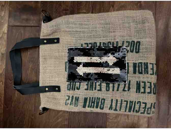 Designed jute bag, hobo style with sequin doble arrows with strap