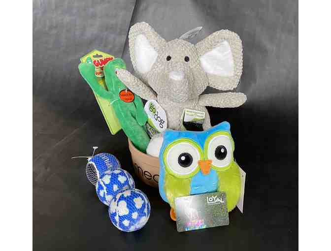 Bloomingdale pet ceramic bowl filled with chewy toys, balls and $50 Loyal Gift Card.