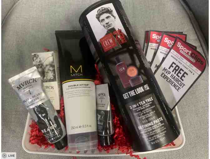 4 coupons for free MVP haircut at Sports Clips. Basket includes 3-in-1 tea tree shampoo, conditioner and body wash, skin lotion, beard oil, 2-in-1 shampoo and conditioner, shaving cream.