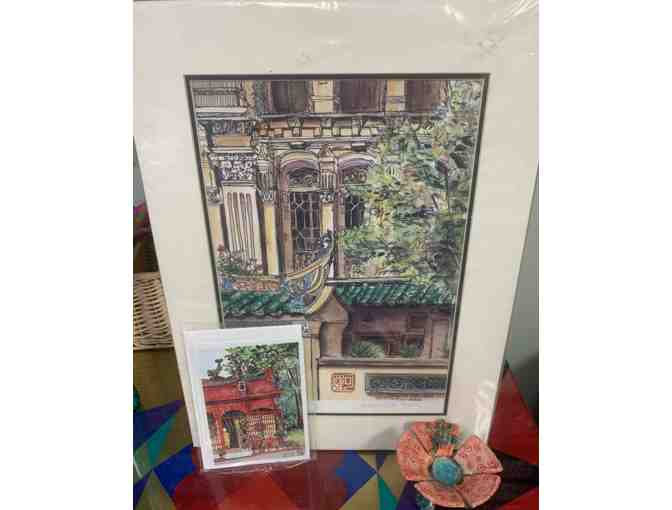 Hang this beautiful art piece by artist Carol McTee Roach (grandmother to Isabella, Toddler B, and AnnaSophia, Twos) in your home! One big watercolor print, cards, and a ceramic flower dish with frog.