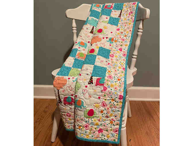 The top of this adorable quilt is 100% cotton, the backing is a poly/cotton blend. The fabrics are decorated with elephants, hearts and flowers in bright colors.