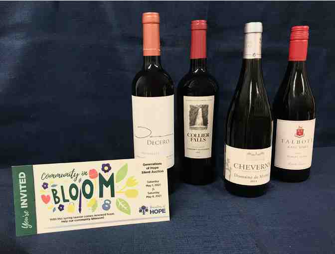 Four (4) bottles of Red Wine: Decero Malbec 2016 (Argentina), Collier Falls Cabernet Sauvignon 2011 (California), Cheverny Domaine de Montcy 2013 (France), Talbott Kali Hart Pinot Noir 2017 (California)