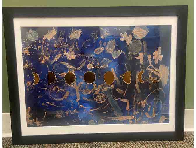 Ms. Kelsea and Ms. Maiko's class was inspired by their studies of the phases of the moon. Their art pieces were created using different shades of blue watercolor to represent space and glitter paint for the stars. The moons were cut out using push pins. The final works illustrate each moon phase, from full to new. Beautifully framed and ready for your wall!
