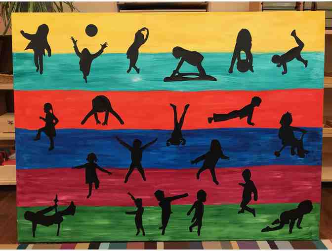 Our fUNDERaiser project stemmed from an artist study on Edgar Degas, who was known for showing the human form in moments of movement. What's one thing children love to do? MOVE! So, our class looked at different ways we can move our bodies and tried to capture these movements in picture form. From there, we cut out black silhouettes of each child moving in some way and adhered them to a large canvas that the children helped paint. The result? A fun work of pop art depicting movement in human form, or more specifically, child form.