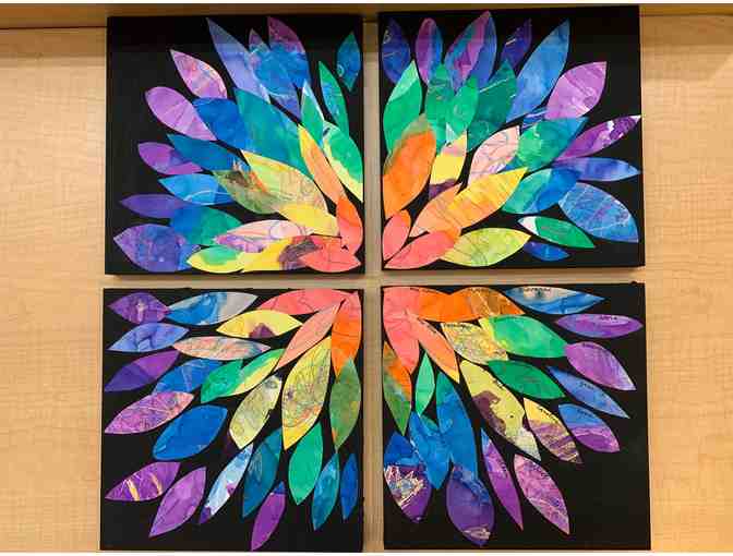 Early Childhood Southwest classroom has a great love of all things rainbow. Our class created a rainbow flower to honor the coming of Spring. We were inspired by the time we spent in our courtyard this year, cultivating a garden that we could enjoy when the weather warmed. The members of our classroom drew pictures with crayons, then painted over the pictures with watercolor paint to create a deep rich dimension of color. The children then cut their picture into petal shapes that were arranged on the black panels to create a flower. One panel of petals has the children’s names written on their contribution to this beautiful piece.