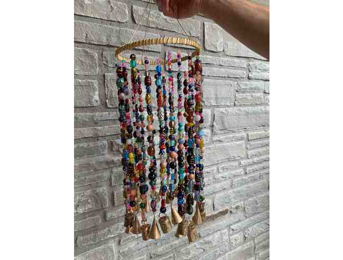 The handmade wind chime is approximately 8 inches wide and 18 inches long with a bamboo wood top. Each strand is hand-strung by the student with high quality glass and lampwork beads and bells. Artistically chosen to dazzle in the sun and produce a pleasing song in the wind. No two stands are alike! This piece of artwork will complement any outdoor space.