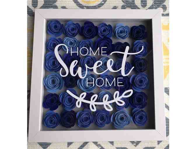 8x8 white home sweet home vinyl shadow box with blue paper flowers.
