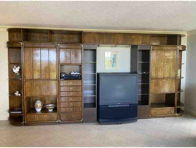 Wood & Brass Entertainment Center – ten piece wall system, approximately 15 ‘ long.