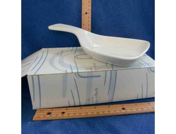 Serving dish/bowl with handle for stylish serving of tapas and finger food. Dishwasher and microwave safe, high quality premium porcelain made in Germany - a perfect complement to white or ivory tableware, including Villeroy & Boch's Artesano Professionale and other lines. Boxed.