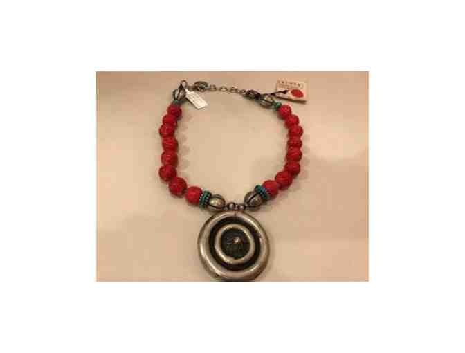 Single strand gorget syyle collar of red stained coral rounds carved with traditional symbols and motifs, some with detail form China's Asian waters. Featuring a silver/white brass alloy puffy disc pendant with fine floral detail from the Hunan Tribes people of China. Arizona turquoise discs and tiny rondelles, plated funishings and sister clasp with coin (fifteen kopecks, 1979-USSR) are included to complete this necklace.