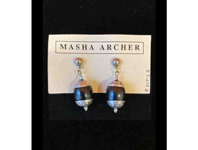 Black colored stained tree resin earrings in siler filttings with swirling morifs from Tibet.