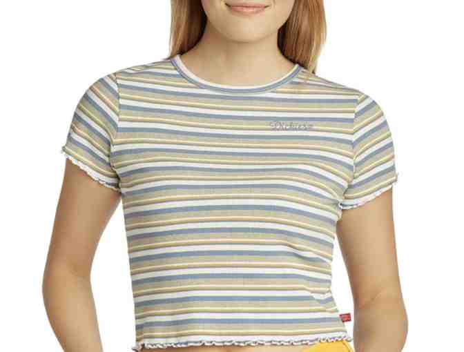 Lettuce-edge trim and crisp stripes call on throwback nostalgia with this cropped T-shirt from Dickies. SIZE: Juniors Large