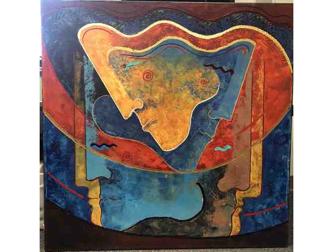 Original painting by Gaylord Soli titled 'The Council' measures 40" x 40". Gaylord Soli Artist and Printmaker: Having built a series of successful businesses around his passion for art and design, Gaylord Soli founded Clearwater Publishing in the 1980s and began to produce high quality serigraphy prints for fine artists including Ivan Earl, Richard Diebenkorn, Mel Ramos, and Peter Max. His own art draws on his years of travel throughout Mongolia, Pakistan, Iran, and the Amazon basin, and his life-long fascination with primitive cultures. Using a rich and earthy palate, Soli layers, scribes, and textures his canvases in a unique kinship with early artistic and organic processes. His paintings show the influence of Picasso, Tamayo, Auerbach, and Hans Hoffman, and are informed by a deep love of music and the spiritual. In his series "The Composers," Soli brings some of the world's great composers to canvas in an array of rich and beautiful images, painting the music as much as the musician.
