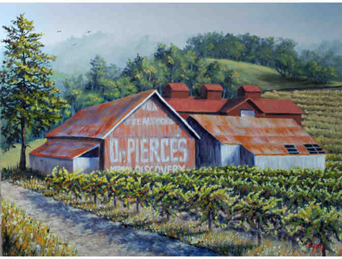 Original 18 x 24 oil painting "Dr. Pierce's Barn" of barn and vineyard located north of Healdsburg in 3 inch dark wood frame by artist Judy Boles.