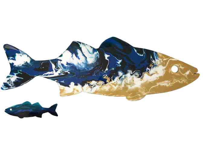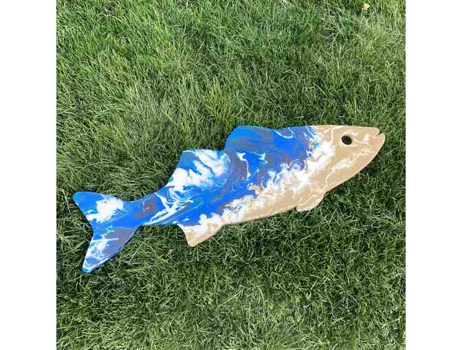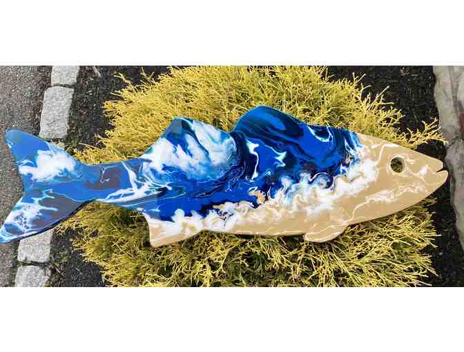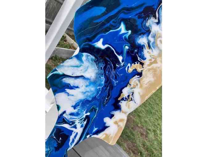 Description: My Hyper Striper, entitled Just Flow With It, is inspired by the bird's-eye view of the ocean and represents the free flowing nature of water with dark blues, greens, sandy browns and white streaks. The process of creating this work was very much a practice in releasing control, putting my faith in the harmonization of the paint and flow medium, letting gravity do the work and just going with flow.