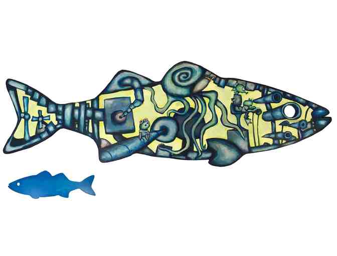 Description: My Hyper Striper has been taken over by an intrepid family of marine scientists, to explore never before regions of the deep blue world and defend aquatic wildlife from the over-reach of mankind. In this painting we see Captain Trencher and Navigational expert Leapy Amphibious boldly charting a course for the unknown. First mate Bubbles McQuatica appears to be zoning out, but he's probably exhausted after a thorough maintenance check of the submarine's complex internal technologies. If you purchase this cyber-fish-submarine, these valiant explorers will see that you are never lost on land or sea.