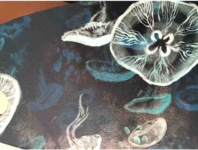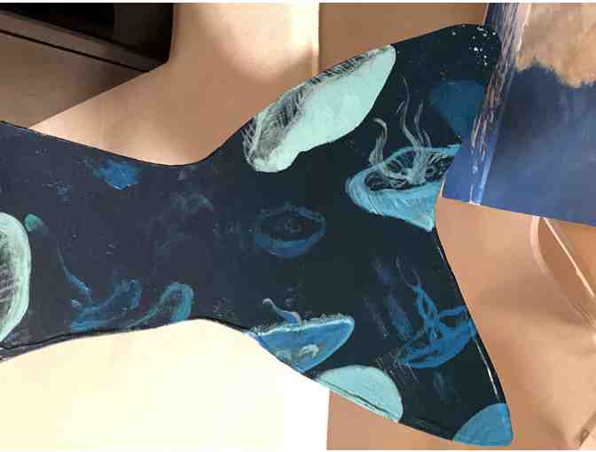 Description: My Hyper Striper, entitled Bioluminescence, is inspired by the mysterious and beautiful jellyfish, an organism that reminds me just how alien and unfamiliar our oceans are. I have always held a deep reverence for the ocean, coupled with a healthy amount of fear. Deep water has always frightened me because of how unknowable and vast it is, but that's also what makes the ocean so captivating. In my bass, I've painted gently floating jellyfish receding back into the darkness. Each jellyfish emits a soft glow, and is suspended lazily on its own plane, almost swaying back and forth with the current of the water.